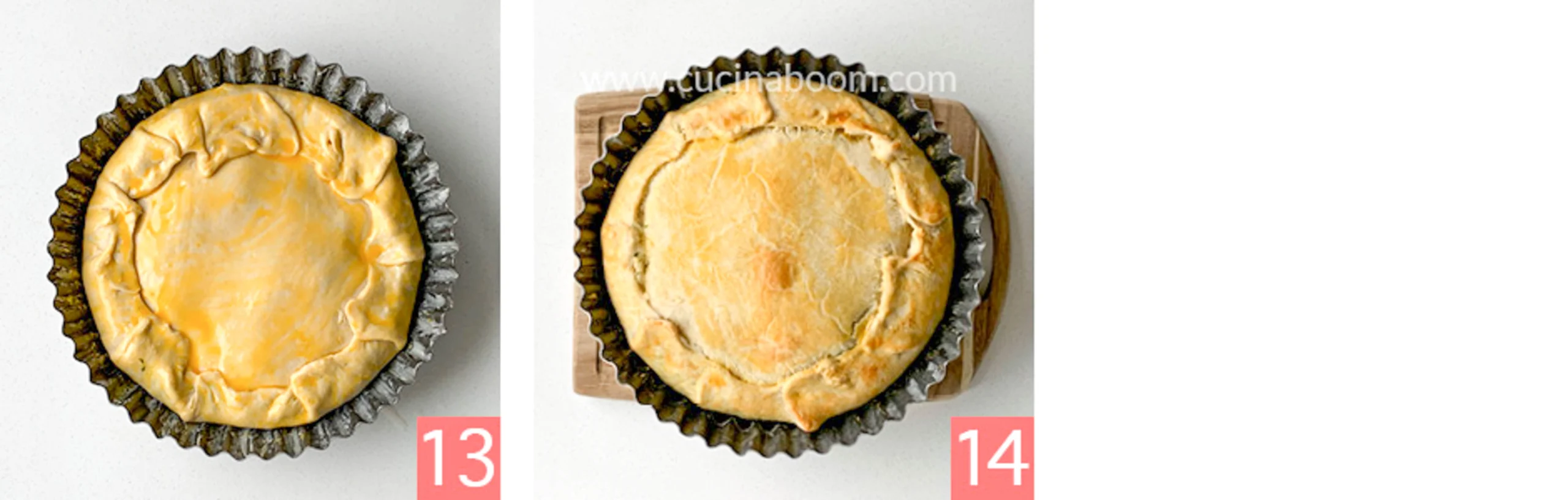 • Bake in a static oven at 200°C (392°F) for 25-30 minutes until golden brown (Photo 13). Remove from the oven (Photo 14), let the pie fully cool, then gently take it out of the baking dish.