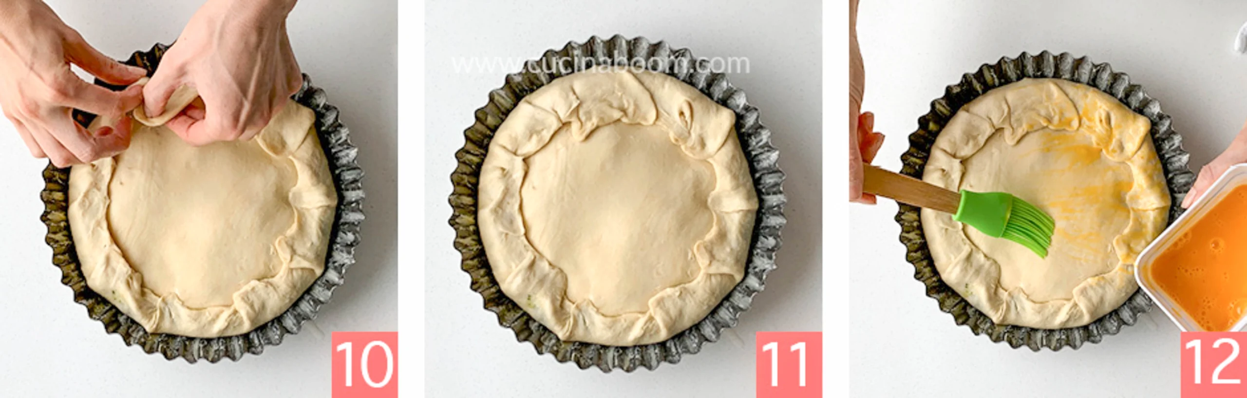 • Cover with the second pastry sheet (Photo 10), carefully sealing and crimping the edges (Photo 11).Brush the top with a mixture of beaten egg yolk and a little milk or cream (Photo 12).