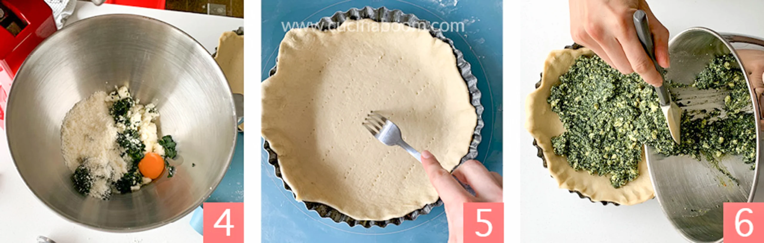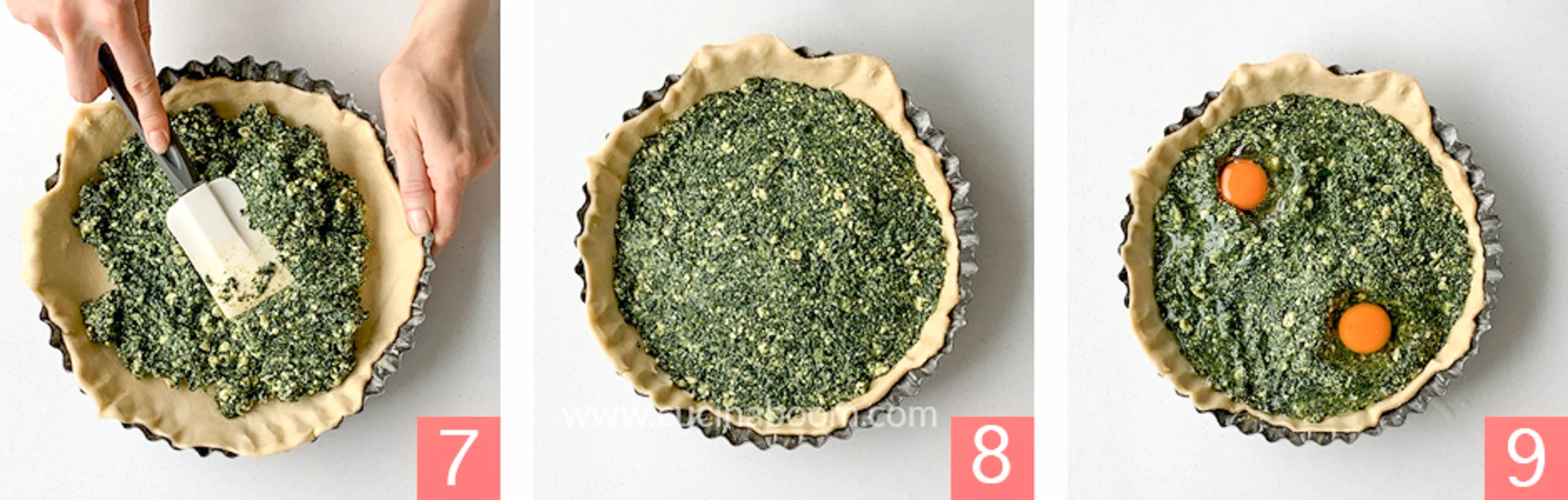 • Grease the baking dish generously with cold butter, dust with flour, and shake off excess. Place the larger pastry sheet inside, piercing it multiple times with a fork (Photo 5) to prevent puffing during baking.Spread the spinach and ricotta filling evenly inside (Photo 6), then smooth out the surface to create an even layer (Photo 7).