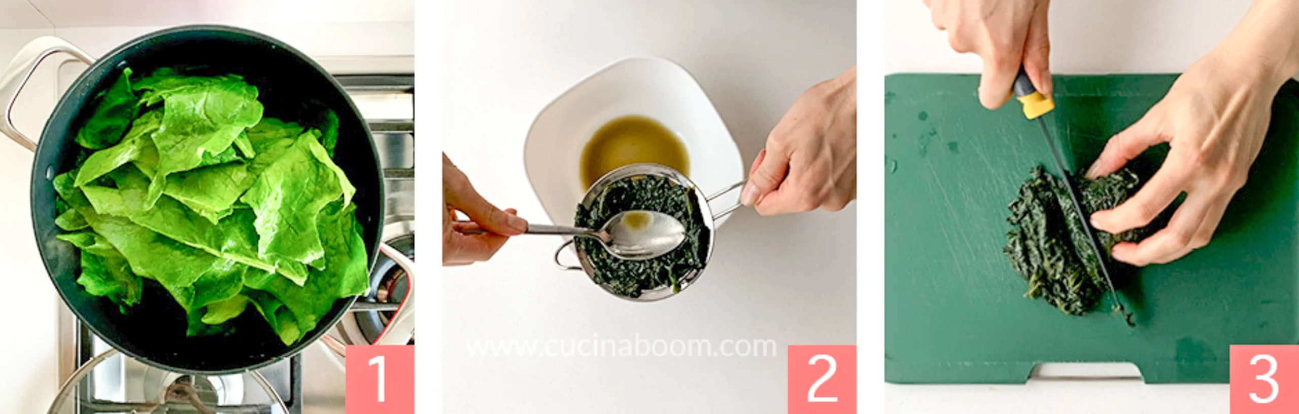 • Wash the spinach, shake off excess water, and sauté over medium heat for 10-15 minutes in olive oil with two garlic cloves (Photo 1). The spinach will significantly reduce in volume.Remove the garlic, transfer the spinach to a sieve (Photo 2), and press firmly with a spoon or spatula to drain excess moisture.Chop the drained spinach on a cutting board (Photo 3) and transfer it to a mixing bowl.