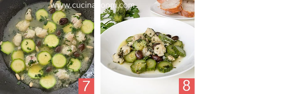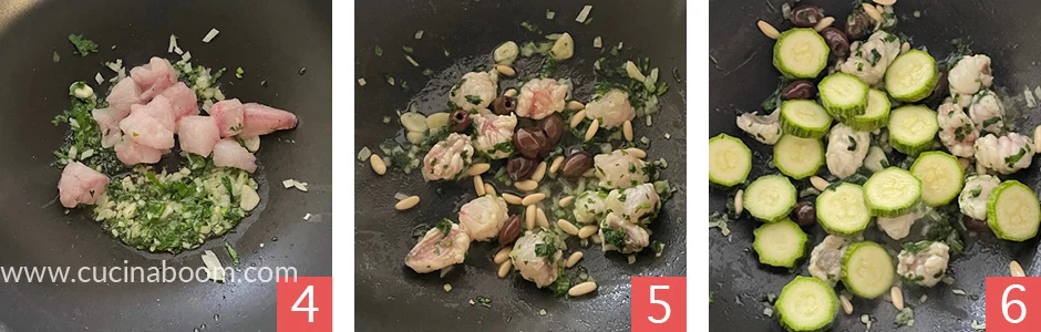 • Add the monkfish fish to the pan with the onion and parsley and cook for a few minutes (photo 4). Add the olives and pine nuts (photo 5). At this stage, you can splash the contents of the pan with dry white wine. Next, add the zucchini cut into thin rounds (photo 6).