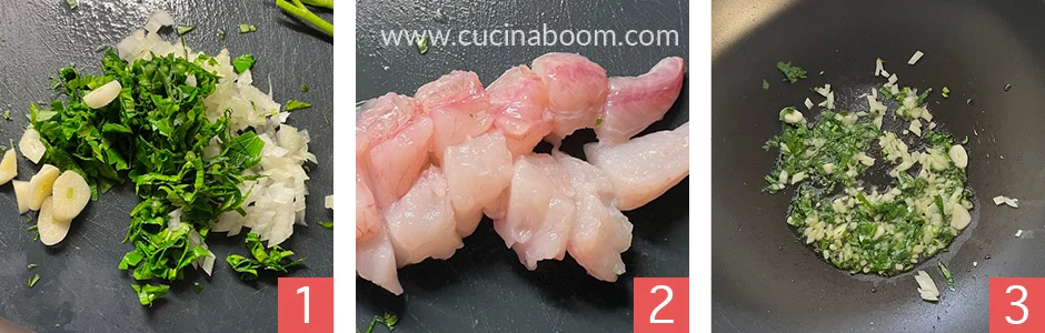 • Peel, rinse, and finely chop the onion. Do the same with the parsley, and slice the garlic thinly (photo 1). Cut the monkfish fillet into cubes (photo 2). Heat a pan with olive oil, add the onion, garlic, and parsley, and sauté lightly (photo 3).