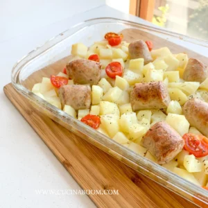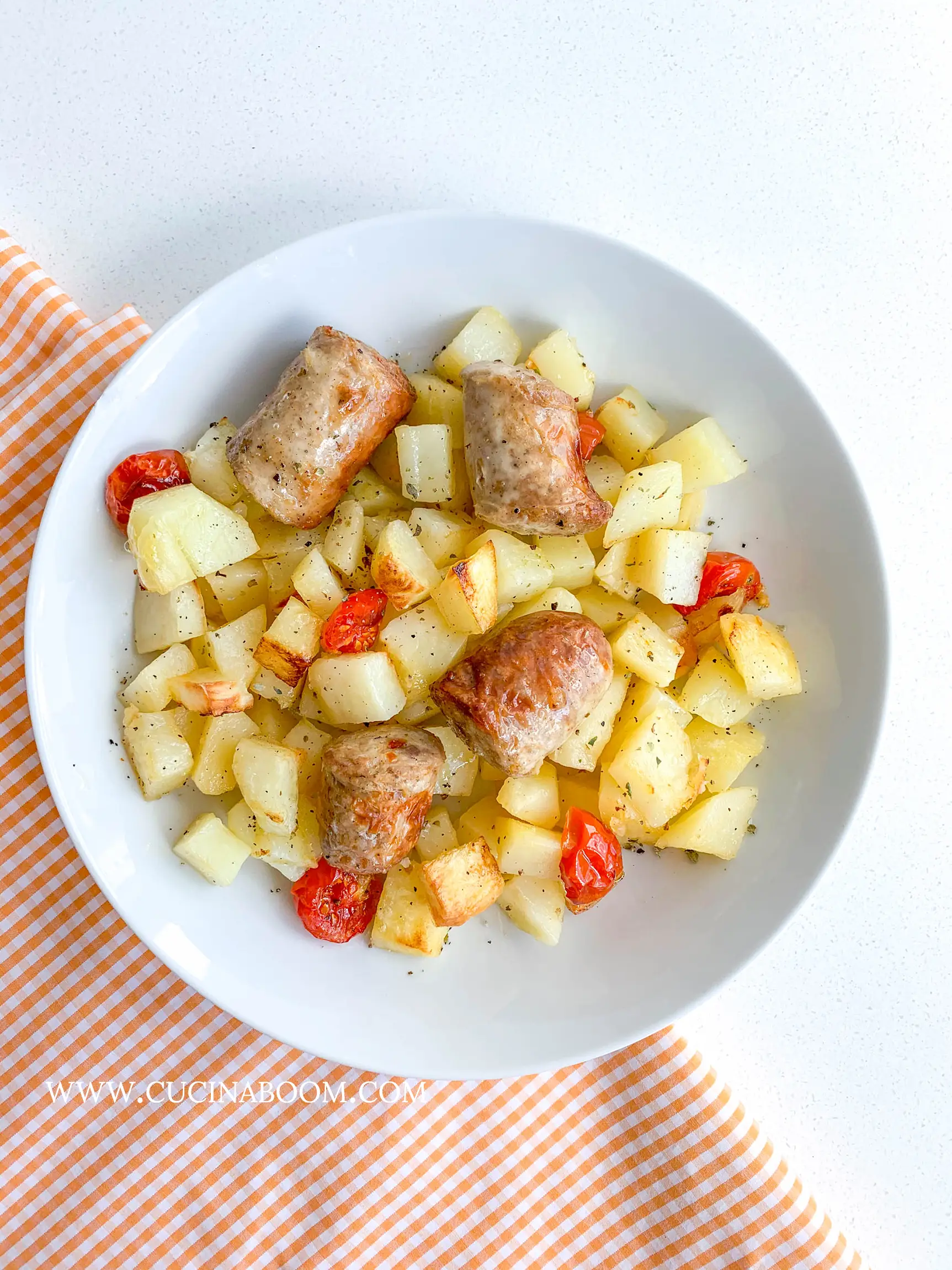 - Grease a baking dish with olive oil. Add the parboiled potatoes. Cut the cherry tomatoes in half (or leave them whole, if you prefer) and add them to the dish. Cut the sausages into pieces about 3–5 cm long and add them as well. Season with salt and pepper, sprinkle with oregano or rosemary, and tuck 4–5 garlic cloves between the potato pieces.