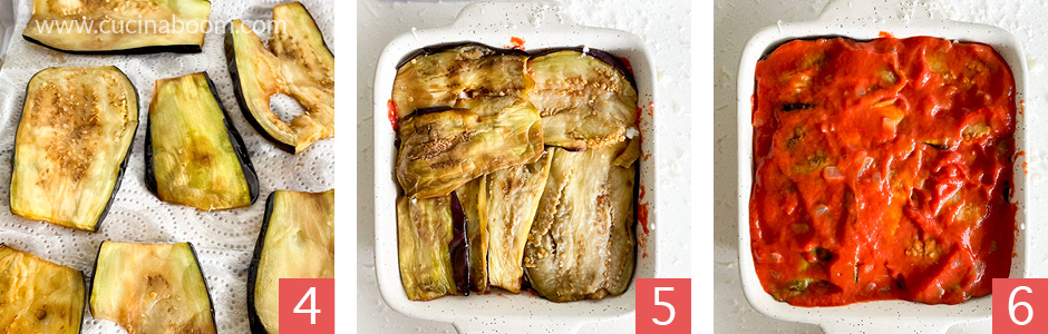 - Spread a few spoons of the tomato sauce with egg on the bottom of the baking dish. Carefully spread it evenly. Place the first layer of eggplants. The slices can overlap each other (photo 5). Cover the eggplant layer with a layer of tomato sauce without egg (photo 6). On top, you can add a few fresh basil leaves. Sprinkle with Parmigiano (photo 7) or add a layer of mozzarella. Then cover again with eggplants. Repeat the layers: eggplants/tomato sauce/cheese until the eggplants are finished.