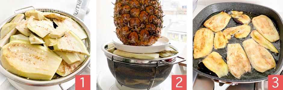 - Wash the eggplants and slice them into 0.5 cm thick pieces. Place them in a colander, sprinkling each slice with salt. Ideally, use sea salt, as it dissolves more slowly (photo 1). But table salt can also be used. Cover the filled colander with a lid and place something heavy on top of a plate. I use a pineapple as a press (photo 2) – but you can use a bottle of water or any other heavy object. If it’s hot at home, the eggplants under the press should go into the refrigerator. They should sit like this for 12 to 24 hours and release a lot of brownish water.