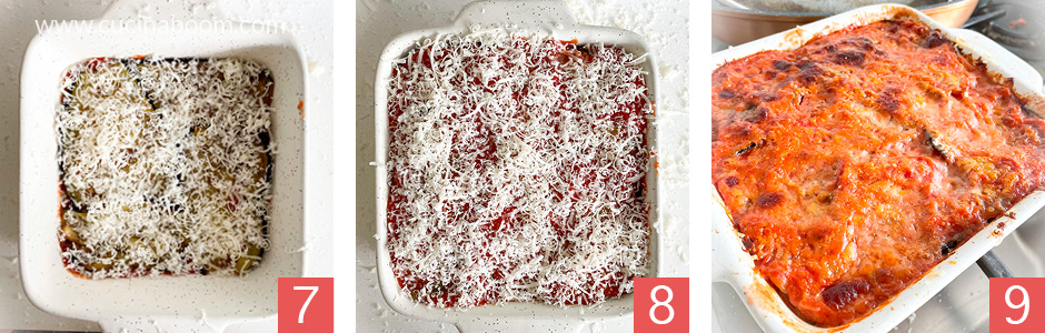 - Cover the last layer of eggplants with tomato sauce mixed with egg and generously sprinkle with Parmigiano (for both versions – with Parmigiano only or with mozzarella – the final layer is always the same: generously topped with Parmigiano) – photo 8.You can also sprinkle the top of the Parmigiana with a spoon of breadcrumbs – this will give it a delicious golden crust.