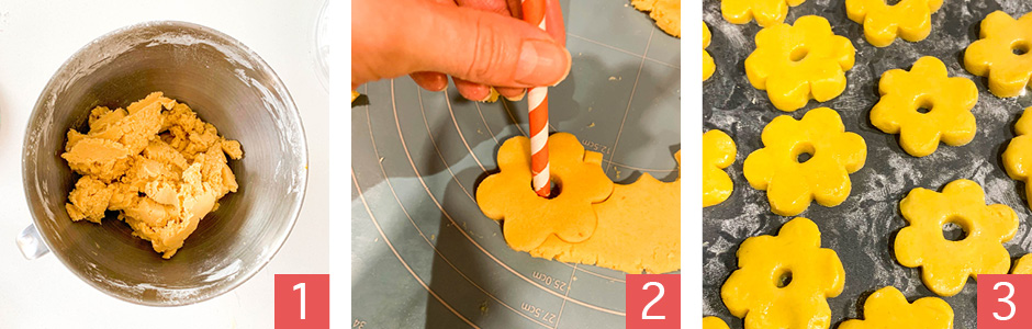 • Вбиваем желтки. И замешиваем тесто (фото 1). Сливочное масло должно хорошо разойтись по тесту и не должно быть заметно в виде желтых или белых кусков. Заматываем тесто в пленку и убираем в холодильник на 30-60 минут. Это нужно для того, чтобы сливочное масло в тесте застыло.Охлажденное тесто раскатываем скалкой. Тесто не должно быть тонким, т.к мы не используем разрахлитель. Высота теста 5 мм. Выдавливаем печенье формочками в виде цветка с шестью лепестками. Проделываем отверстие посередине (фото 2). Выкладываем сырое печенье на противень застеленный бумагой для выпечки, либо смазанный сливочным маслом и обсыпанный мукой. Промазываем канестрелли сырым белком (фото 3).