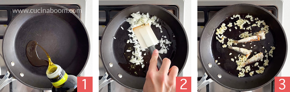 - Спагетти забрасываем в кипящую подсоленную воду и отвариваем в течении 5-6 минут. Пока вода закипает и паста варится, готовим соус. В сковороде разогреваем оливковое масло (фото 1), добавляем немного орегано и засыпаем мелко-шинкованный лук (фото 2). Тушим лук пока он не станет мягким. Из консервы сардин сливаем масло, сардины добавляем в сковороду к луку (фото 3). Сардины разбиваем на мелкие кусочки при помощи лопатки (смотрите видео-рецепт).