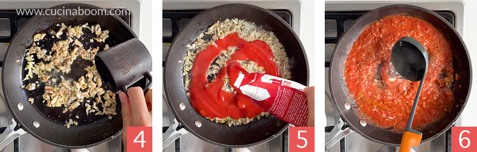- Вливаем белое вино (фото 4). Выпариваем вино на средне-низком огне и как только уйдет алкогольный запах добавляем томатную пассату (фото 5). Перемешиваем. Вливаем примерно 1 половник воды, в которой варятся спагетти (фото 6). И снова перемешиваем (фото 7).