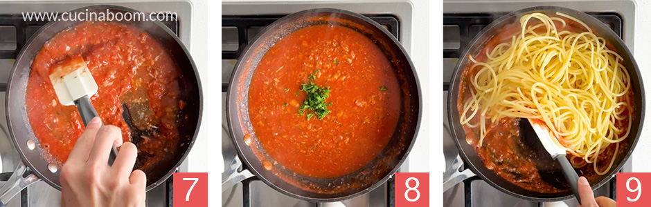 - Соус из сардин присаливаем. Добавляем свежую нарезанную петрушку (фото 8). Перемешиваем. Спагетти откидываем на дуршлаг. Предусмотрительно отлив в кружку воды, в которой она варилась (будем подливать ее в соус). Спагетти выкладываем в сковороду к соусу из сардин (фото 9).