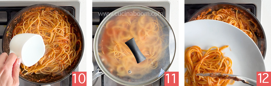 - Перемешиваем. Вливаем немножко водички, в которой варилась паста (фото 10). Накрываем крышкой (фото 11) и томим 2-3 минуты, пока спагетти не дойдут до желаемого уровня готовности.