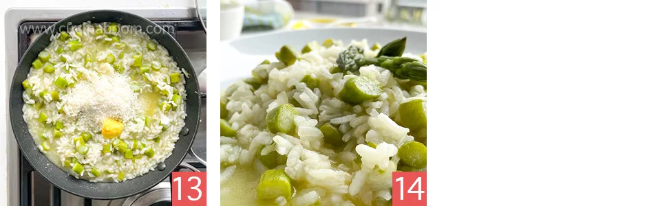 • Выключив огонь под сковородой с ризотто, засыпаем пармезан и добавляем кусочек сливочного масла (фото 13). Перемешиваем, накрываем крышкой, даем еще минутку пропариться и слегка остыть и раскладывам по тарелкам, поверх выкладываем цветки спаржи (фото 14).