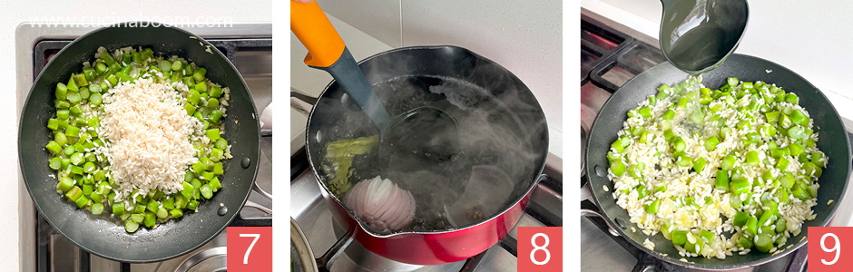 • Немного повышаем огонь, перемешивая даем лишней воде испариться, а рису немного изменить цвет под действием температуры. Овощной бульон держим кипящим (фото 8) в течении всего процесса приготовления ризотто со спаржей. Вливаем пару ополовников бульона в ризотто (фото 9). Рис должен быть слегка покрыт водой.