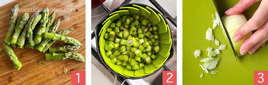 • В первую очередь для ризотто необходимо приготовить овощной бульон. От спаржи нужно обрезать примерно 4-5 см от основания – обычно эта часть выходит жесткой. Затем обрезать цветки (фото 1) – поскольку они провариваются быстрее ствола, варить их будем отдельно. Ствол нарезаем кусочками пол пол см и отвариваем на пару (фото 2) минут 5, спаржа должна остаться сдлегка хрустящей. В это время мелко шинкуем лук (фото 3).