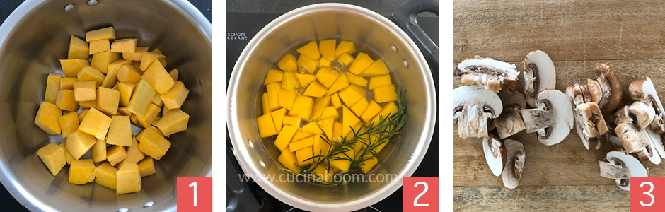 - Тыкву для ризотто очищаем от кожуры, промываем, нарезаем кусками и выкладываем в кастрюльку (фото 1). Заливаем водой, добавляем веточку розмарина (фото 2). Ставим на небольшой огонь. Пока тыква варится, беремся за грибы. Очень быстро промываем их под проточной водой и обтираем насухо салфеткой, либо если они без сильных загрязнений – протираем влажным чистым полотенцем. Нарезаем грибы дольками (фото 3).