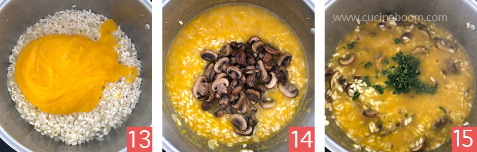 - Тыкву с небольшим количеством бульона перемалываем до кремообразного состояния (фото 12). Добавляем ее к полуготовому рису. Размешиваем. Добавляем обжаренные в сливочном масле грибы (фото 14). Следим за уровнем жидкости, еще подливаем бульона от тыквы.За пару минут до готовности добавляем свежую петрушку и солим (фото 15).