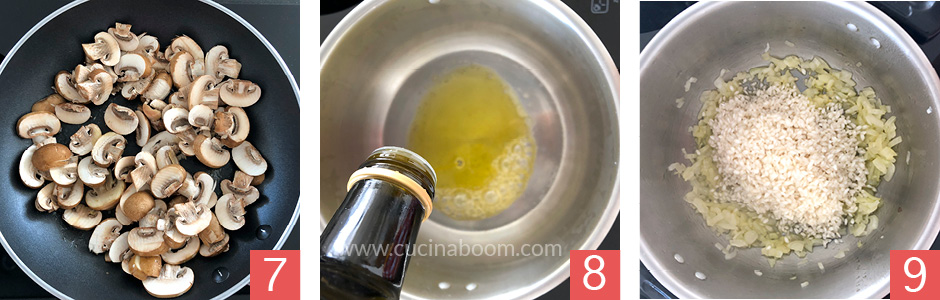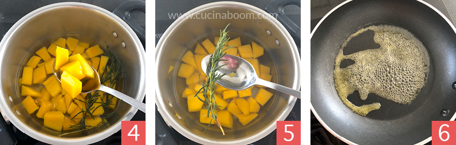 - Проверяем тыкву на готовность – она должна стать мягкой, но не потерять форму (фото 4). Вынимаем розмарин (пока он не начал терять кусочки) из воды в которой варилась тыква. Саму воду не выливаем – назовем ее бульон – она пойдет на долив в ризотто. В сковороде растапливаем слив.масло (фото 5). И добавляем туда грибы (фото 7). Грибы нужно обтушить на средне-высоком огне до 3/4 готовности.