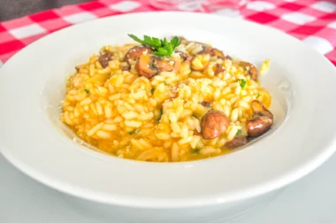 Этот итальянский рецепт ризотто не только содержит грибы в своем составе, но заправлен еще и кремом из тыквы, которая органично сочетается со вкусом шампиньонов. Распознать тыкву в готовом блюде довольно сложно, а выходит ризотто откровенно ВКУСНО!