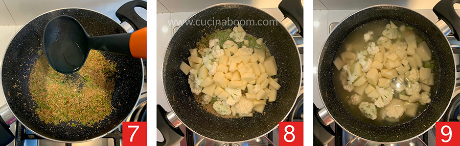 - Вливаем пару половников овощного бульона (фото 7). Добавляем очищенный, промытый и нарезанный кубиками картофель и цветную капусту (фото 8). Добавляем еще немного бульона и 1 лавровый лист, мускатный орех (фото 9).
