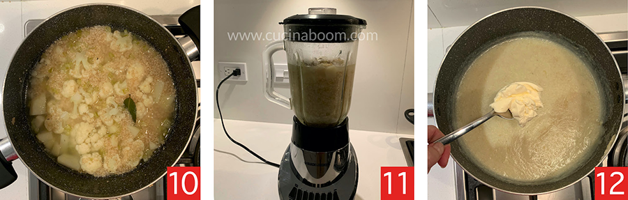 - Варим суп на тихом огне до полной готовности всех ингредиентов, по мере необходимости подливая еще овощного бульона (фото 10). Затем вынимаем лавровый листик!!! И уже готовый суп переливаем в блендер (фото 11). Перемалываем его до однородного состояния. Возвращаем суп в кастрюлю, солим, снова доводим до кипения. Выключаем огонь. Добавляем пару столовых ложек кремо-образного сыра (фото 12). Энергично размешивая, даем сыру хорошо разойтись в супе.