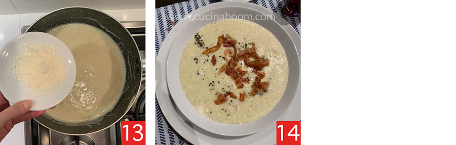 - Засыпаем мелко-тертый пармезан (фото 13) и снова хорошенько перемешиваем. Пробуем, разливаем по тарелкам и сверху раскладываем хрустящую поджаренную панчетту.