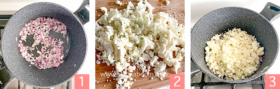 • В отдельной кастрюльке, где и будем непосредственно готовить веллютату, притушиваем в оливковом масле красный лук (фото 1). Цветную капусту промываем под проточной водой, даем воде немного стечь и тонко нарезаем капусту (фото 2). Добавляем цветную капусту к уже прижаренному луку и обтушиваем овощи вместе 2-3 минуты (фото 3).