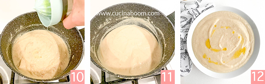 • Возвращаем суп из блендера в кастрюлю. Снова включаем огонь. Если суп слишком густой, можно подлить немного овощного бульона. Пробуем на соль, при необходимости досаливаем. Вливаем свежевыжатый сок 1 лимона (фото 10). Выключаем огонь. Засыпаем мелко-натертый пармезан, хорошенько перемешиваем (фото 11) и разливаем по тарелкам (фото 12).