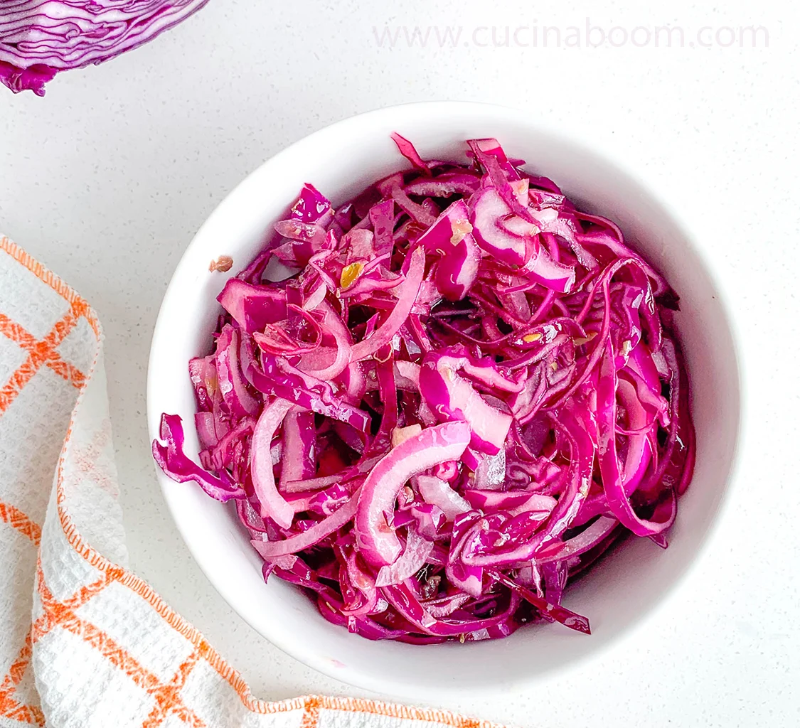 Этот салат из краснокочанной капусты готовится без майонеза и на моей любимой и в общем-то классической итальянской заправке из маринованных анчоусов с чесночком и каперсами.