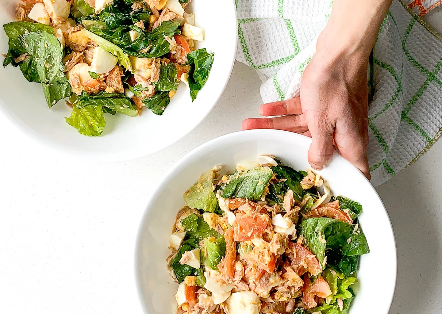 - Листья салата нужно хорошо промыть под проточной водой и обсушить, затем нарвать руками в просторную чашку, посолить и перемешать (фото 2). Яйца отварить, остудить, почистить и нарезать (фото 3).