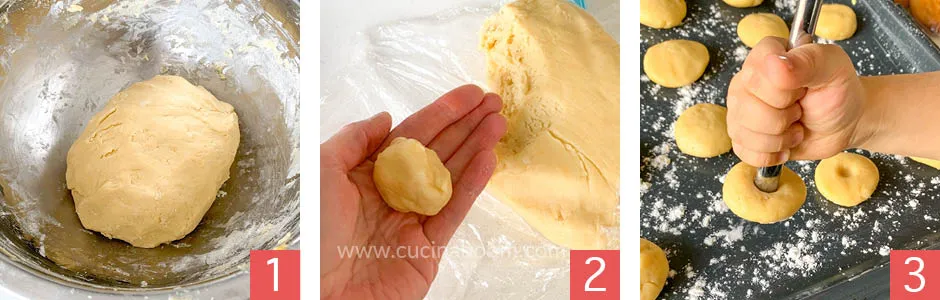 В принципе, молочному печенью можно придать и любую другую форму, но в виде небольшого шарика, слегка сплющенного и с углублением в центре – Джакомо использует обратную сторону десертного ножа, чтобы его сделать – печенье выпекается идеально и не теряет форму.