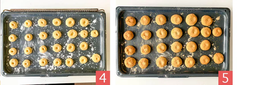 - Слегка придавливаем "шарики" и продавливаем углубление по центру каждой печеньки (фото 3). Противень смазываем сливочным маслом и посыпаем мукой либо используем бумагу для запекания. Выкладываем на печенье на противень (фото 4) на некотором расстоянии друг от друга.Запекаем молочное печенье в разогретой до 180С духовке, в статичном режиме, в течении 15-20 минут до желаемого уровня подрумянивания (фото 5).