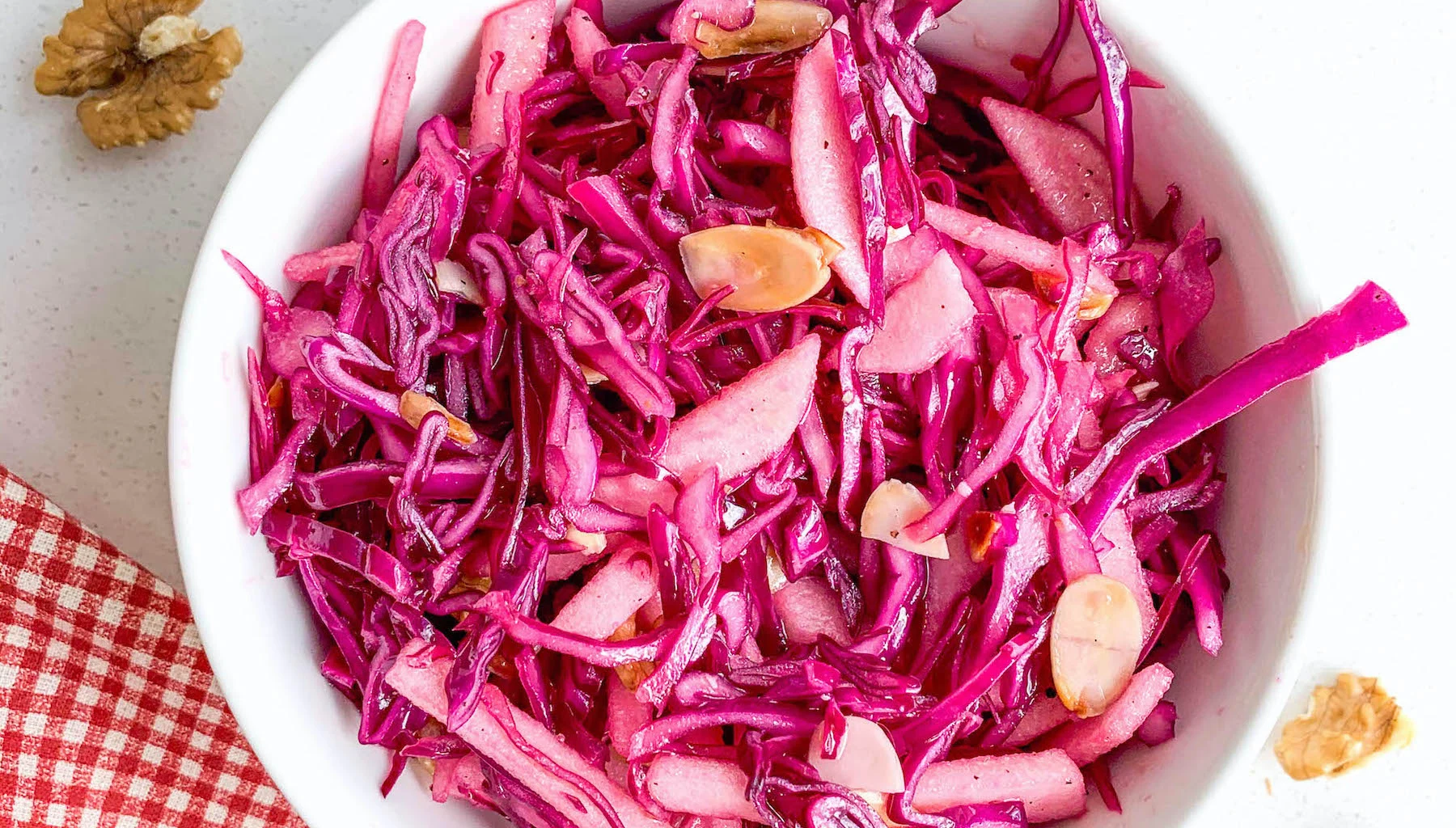 Вместо яблока можно использовать грушу. А также в салат с красной капустой можно добавить изюм без косточек.