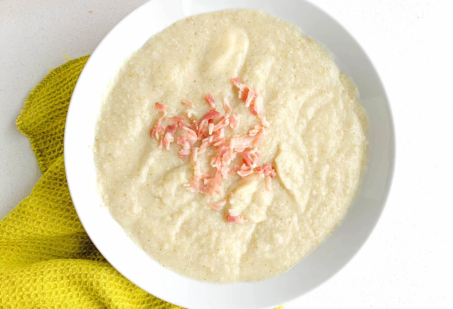 Потрясающий крем-образный супчик из цветной капусты с киноа и панчеттой.