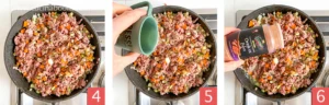 Добавляем в сковороду к овощам фарш (фото 4), энергичко разбивая комочки лопаткой либо ложкой. Вливаем белое сухое вино (фото 5). Добавляем коррицу (фото 6). Размешиваем, при необходимости можно подлить чуточку водички. Но не забываем, что начинка должна быть довольно сухой, так что на момент готовности лишней жидкости в фарше остаться не должно.