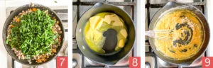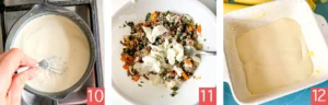 В кастрюльке с толстым дном разогреваем сливочное масло на тихом огне (фото 8). Добавляем муку и хорошенько рразмешиваем венчиком (фото 9). Вливаем теплое молоко тонкой струйкой, непрерывно размешивая венчиком. Продолжаем готовить соус бешамель на тихом огне, размешивая венчиком, пока соус не загустеет. Солим, добавляем мускатный орех. Даем немного открыть под крышкой.