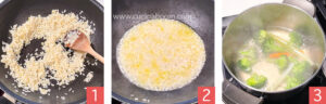 В сковороде разогреваем сливочное масло, когда оно станет жидким, доливаем столько же по объёму оливкового. Выкладываем очень мелко шинкованный лук и тушим пока лук не станет мягким. Лук не должен прижариться! Должен остаться прозрачным. Добавляем к луку промытый рис и повысив огонь, непрерывно размешивая, обжариваем рис с луком (фото 1). Как только рис начнет слегка прилипать к сковороде или кастрюле, вливаем кипящий овощной бульон в объёме слегка покрывающим поверхность риса (фото 2).