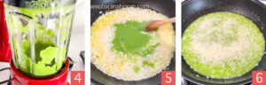 Проваренные брокколи выкладываем в блендер, туда же вливаем небольшое количество бульона и перемалываем до кремообразного состояния (фото 4). Измельченные брокколи добавляем к ризотто (фото 5), при этом рис уже практически готов. Солим, натираем мускатный орех. Всё перемешиваем. Даем ризотто закипеть и выключив огонь добавляем мелко натертый пармезан (фото 6) и холодное сливочное масло.