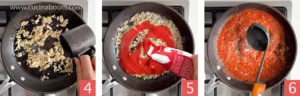 Вливаем белое вино (фото 4). Выпариваем вино на средне-низком огне и как только уйдет алкогольный запах добавляем томатную пассату (фото 5). Перемешиваем. Вливаем примерно 1 половник воды, в которой варятся спагетти (фото 6). И снова перемешиваем (фото 7).