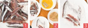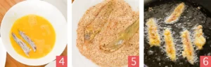 Coat each anchovy first in flour (photo 3), shaking off the excess. Then transfer it to the plate with egg (photo 4), dip it on both sides, and immediately move it to the third plate with breadcrumbs (photo 5).